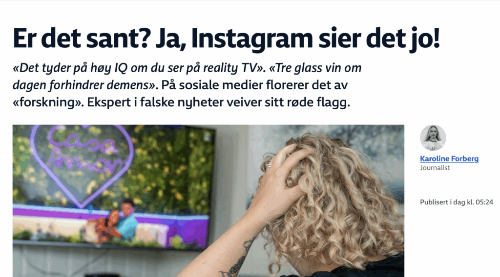 Sosiale medier er blitt en stor kilde til informasjon, spesielt blant unge voksne. Ifølge Statistisk sentralbyrå er plattformer som Instagram særlig populære i aldersgruppen 16-34 år. Det er også denne gruppen som i størst grad blir eksponert for misvisende eller direkte feilaktig informasjon. Problemet er at mange av disse innleggene presenteres på en måte som virker både troverdig og tiltalende, ofte med referanser til «studier» eller «forskning», selv om det sjelden oppgis nøyaktige kilder.